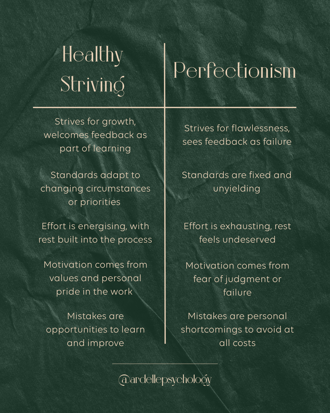 Comparison chart illustrating the difference between healthy striving and perfectionism